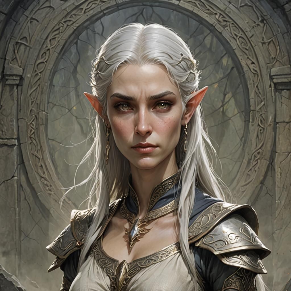 This image shows a pale, gaunt Ayleid female with silvery hair, reminiscent of wild elves from the Elder Scrolls. The portrait blends Art Deco and Ancient Greek aesthetics, in a maximalist digital painting style.