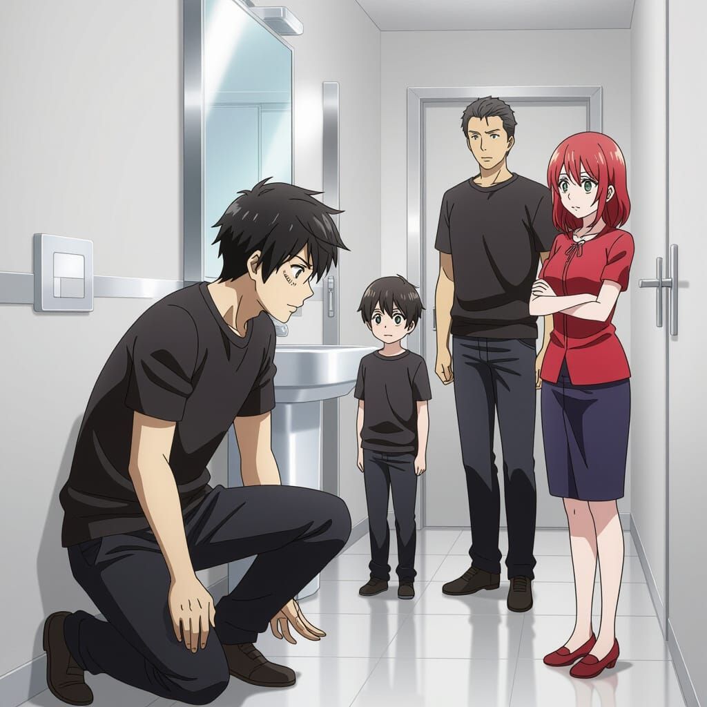 This image shows a boy hiding in a bathroom, looking scared, while his parents confront him about a broken vase. The scene is rendered in a vibrant anime style with bold lines and pastel colors.
