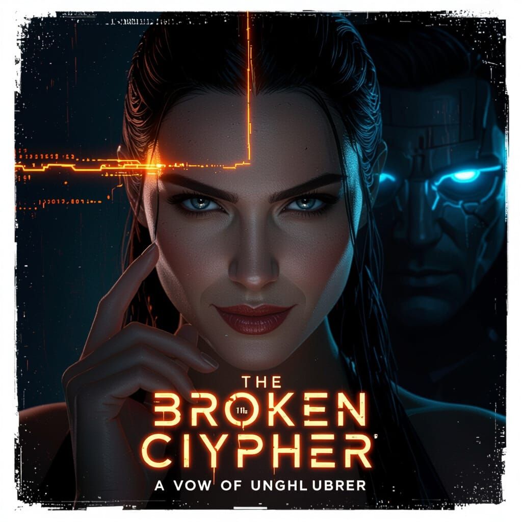 This image shows a striking close-up of a defiant woman with glowing code connecting to her temple, set against a dark background with cybernetic eyes watching her. Photorealistic sci-fi romance aesthetic.