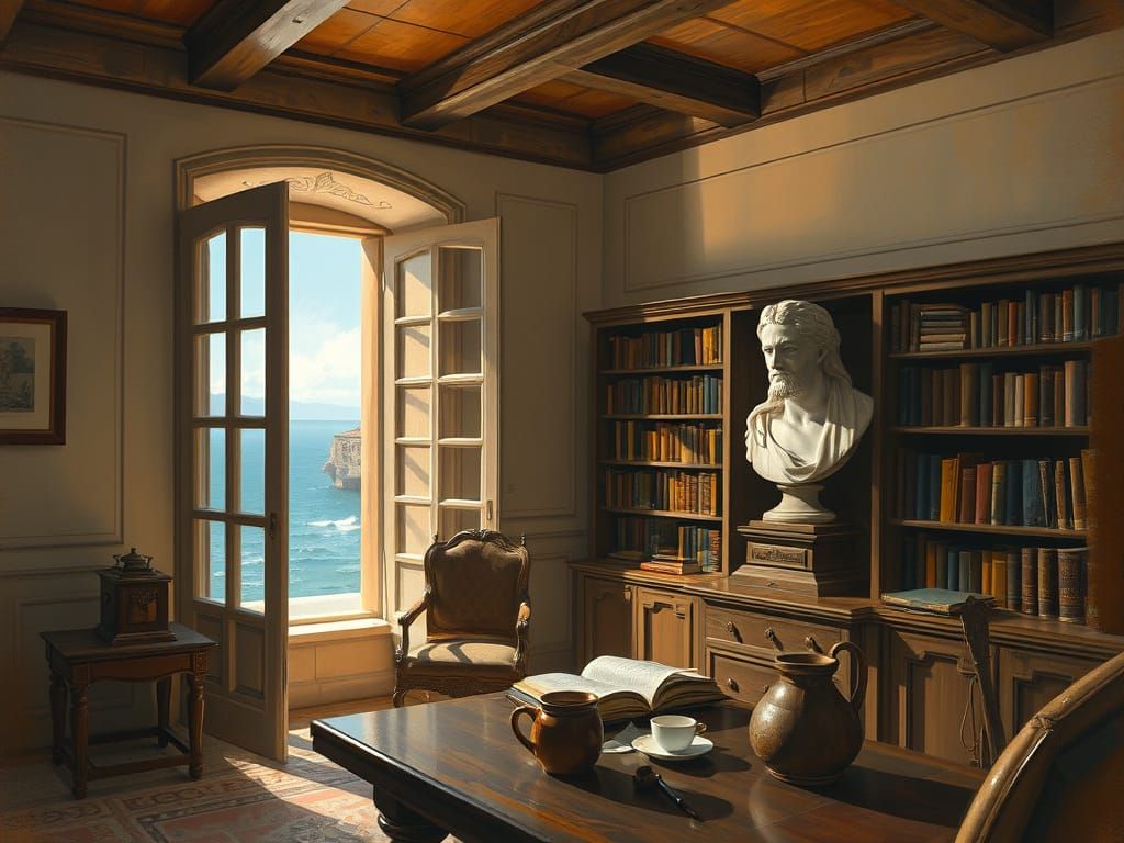 This image depicts a warm, solitary study filled with classical elements. It features ochre and brown tones inside, contrasting with blue outside, and includes a marble bust and bookshelf.