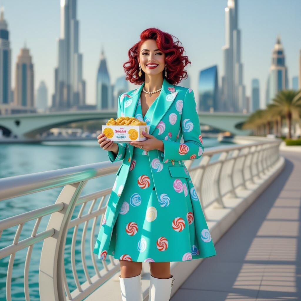 A vibrant image of a woman in a turquoise dress and floral blazer holding crackers near Dubai's Meydan Bridge. Captured in a bright, editorial style photograph with soft morning lighting.