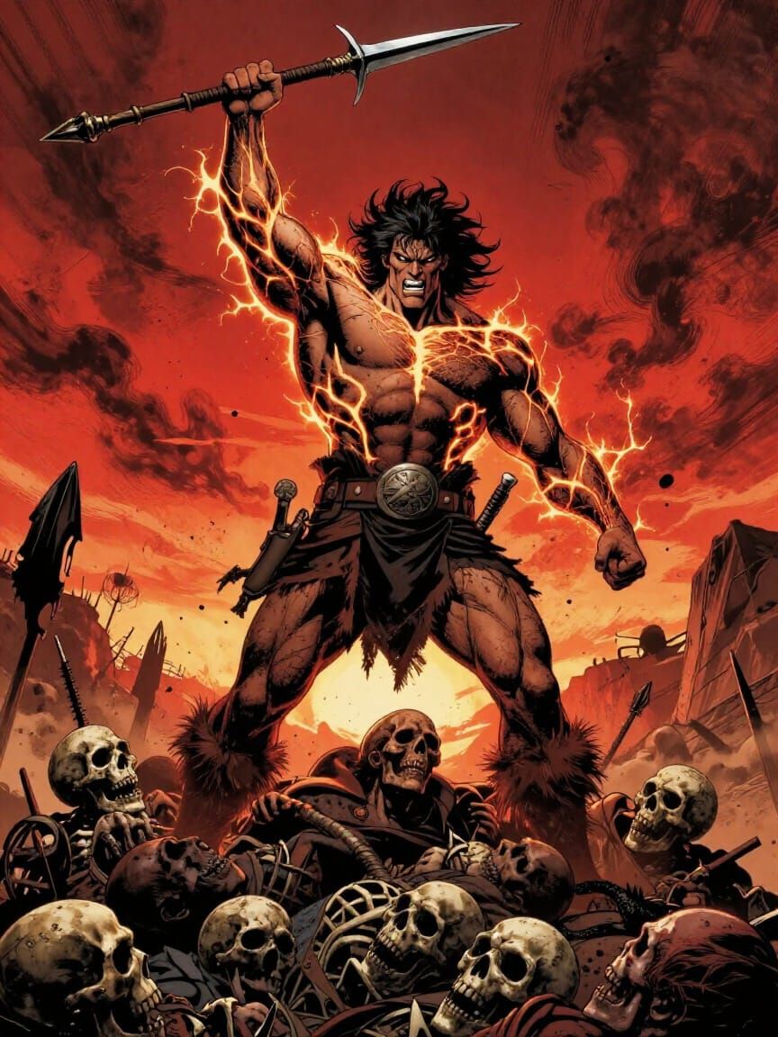 This image features a powerful barbarian on a pile of foes, raising a spear. Rendered in a textured, layered comic style with dynamic anatomy and vivid colors.