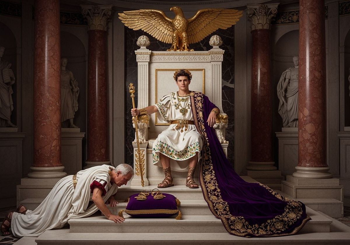 This image shows Emperor Nero seated on a throne as a Roman senator begs for mercy. The throne room is opulent, with marble columns, gold accents and statues. The scene is captured with professional photography techniques.