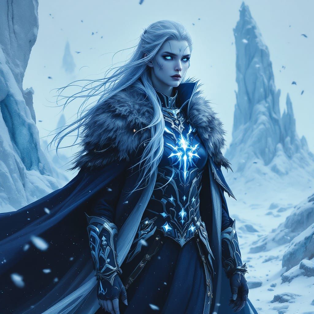 This image depicts a powerful ice queen general in a dark fantasy military uniform on a snowy battlefield. Rendered in a detailed anime-realism hybrid style with digital oil painting and watercolor effects.