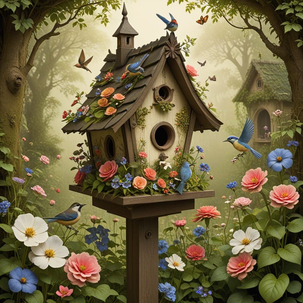 A quaint birdhouse nestled in a vibrant cottage garden. The image evokes whimsical storybook illustrations with colorful, detailed depictions of nature.
