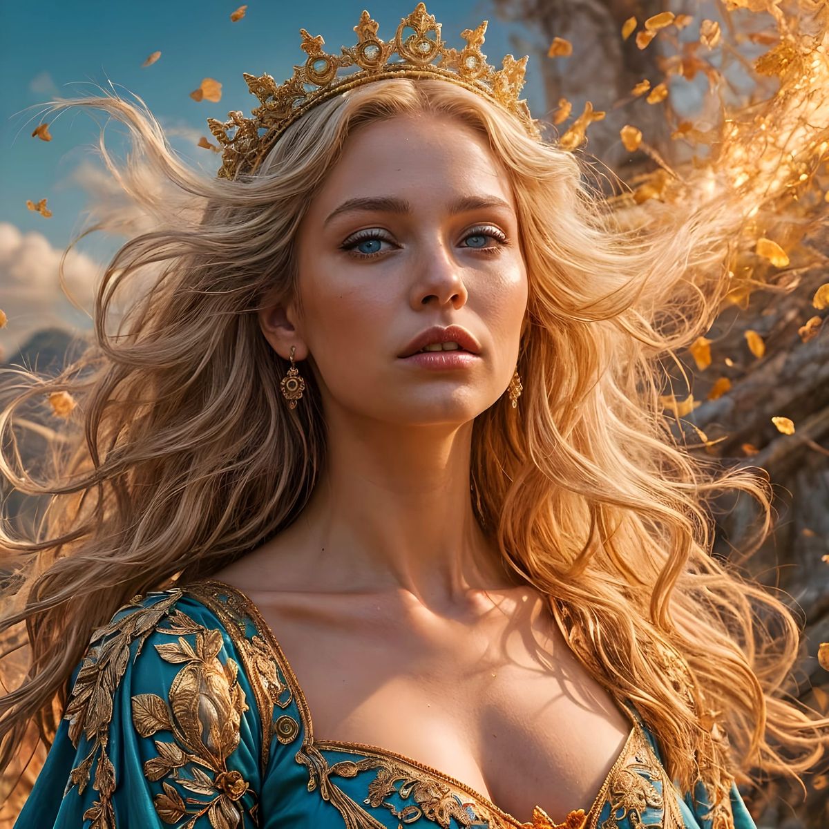 This image shows a majestic, melancholic queen surrounded by an explosion of magical nature, exuding powerful elegance and beauty, with striking blue eyes and long, golden hair