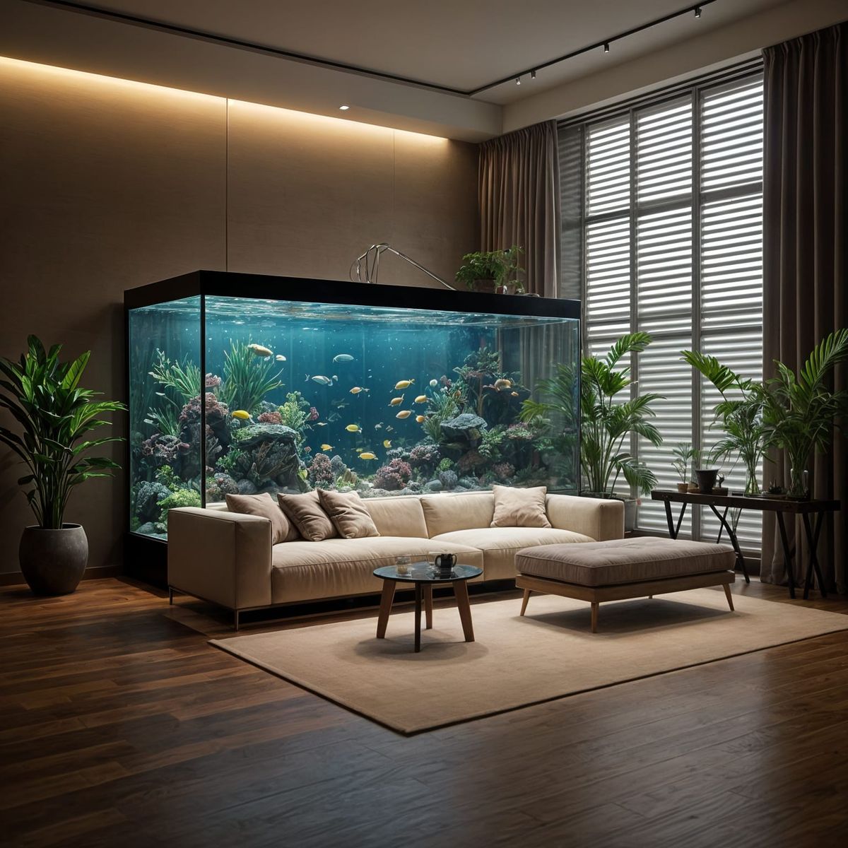A serene and modern living room features a striking transparent aquarium wall, separating the space while showcasing elegant angelfish and lush aquatic plants, amidst a calm and futuristic atmosphere with warm lighting and wooden accents.