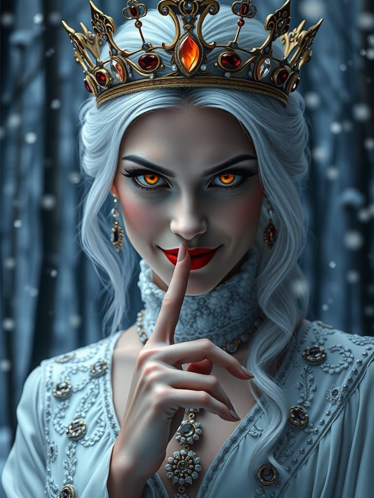 A striking image of a regal vampire queen with white hair and an evil smile, commanding silence. Set against a moody winter forest backdrop with falling snow, rendered in gothic fantasy art.