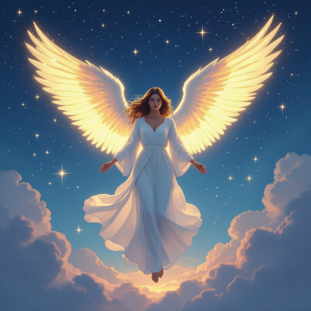 A breathtaking image of an angel with golden wings flying in the night. The artwork features soft brushstrokes and ethereal lighting, reminiscent of dreamy digital art.
