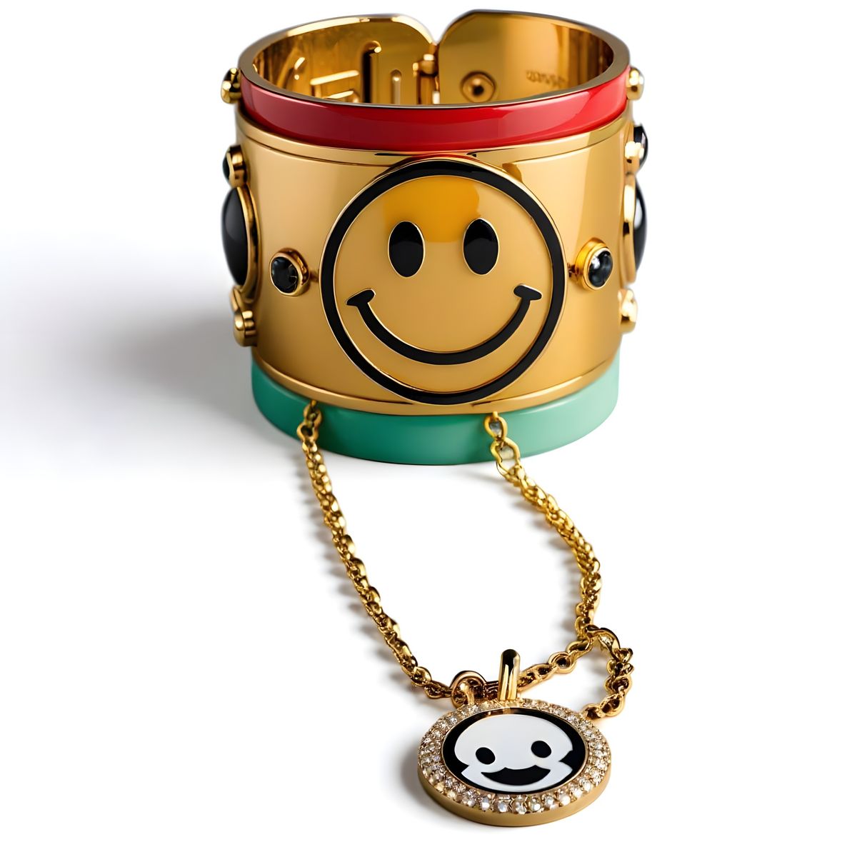 This image shows a luxurious, high-end bracelet featuring a black happy smiley face at its center, reminiscent of Moschino's pop and disco-style jewelry. The background is clean white.