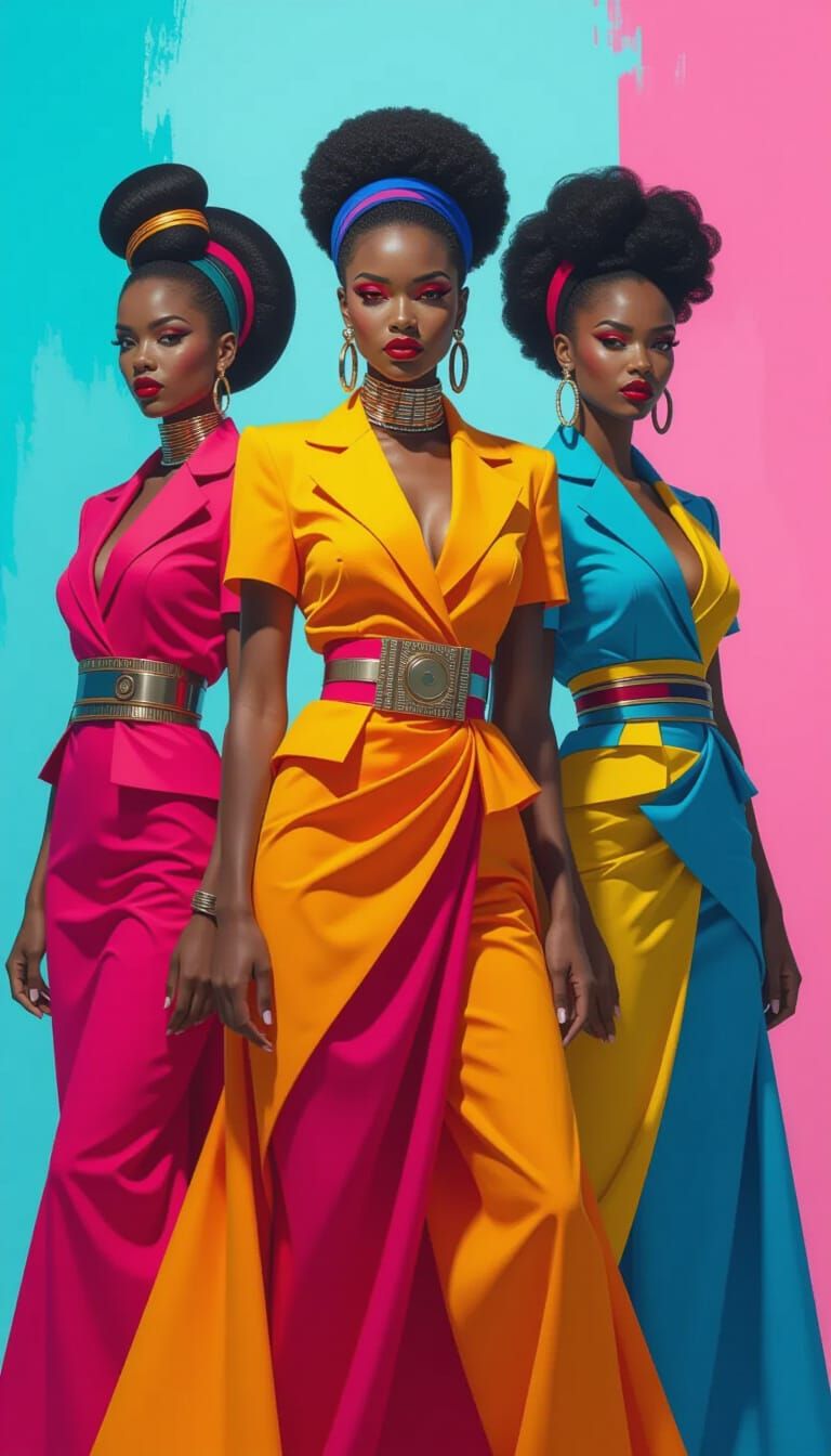 This image shows three women in vibrant clothing against a colorful backdrop. The aesthetic is painterly and cinematic, with bold outlines, dramatic lighting, and a hyperrealistic feel, reminiscent of 35mm film.