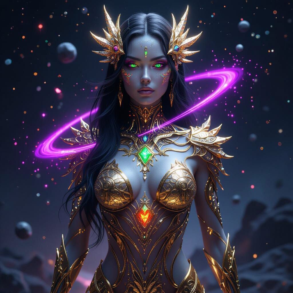 This image shows a hyper-realistic portrait of an ethereal, non-human entity adorned with gold and silver crystal designs. Glowing gamma rays and quantum forms surround her against a dark, starry background, rendered with dramatic cinematic lighting.