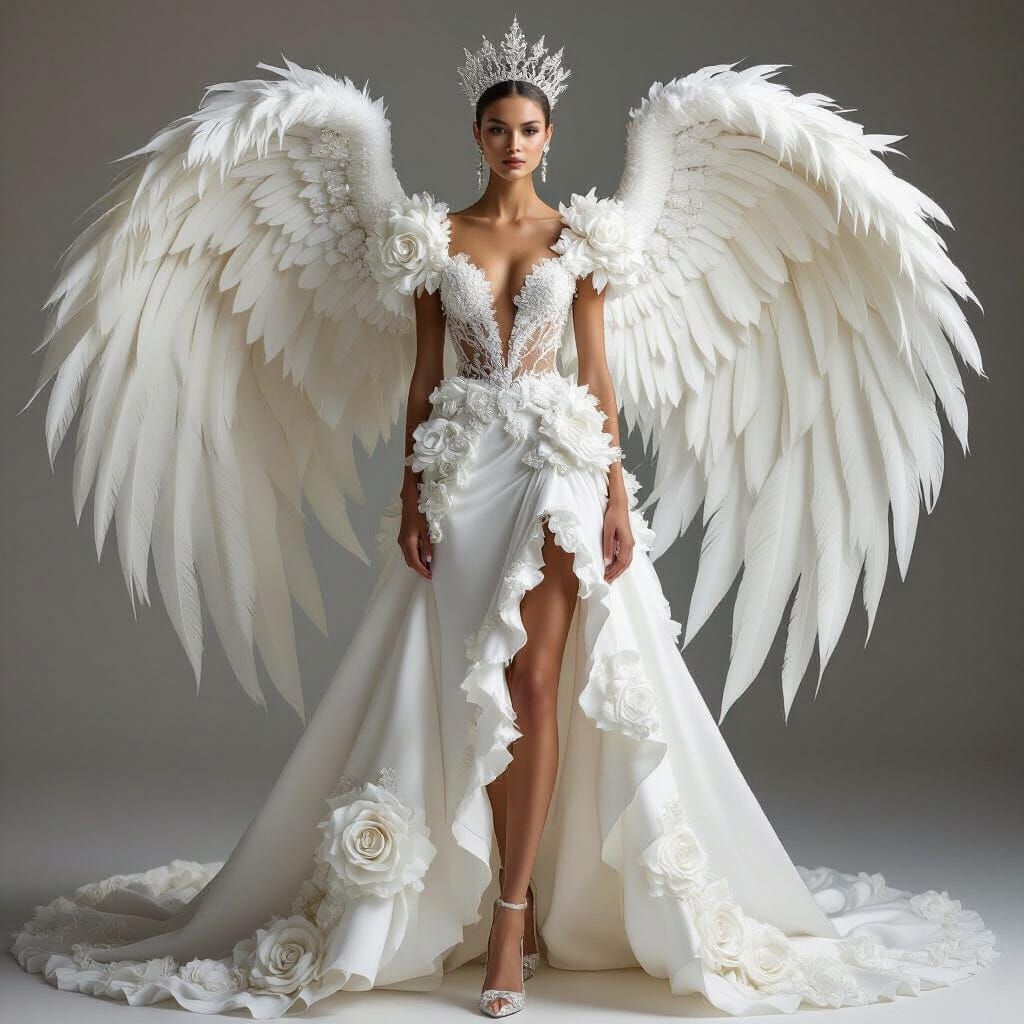 A striking image of a statuesque bride in a platinum-white haute couture gown, featuring swan-feather chiffon wings and rose embroidery. Luxury fashion photography style.