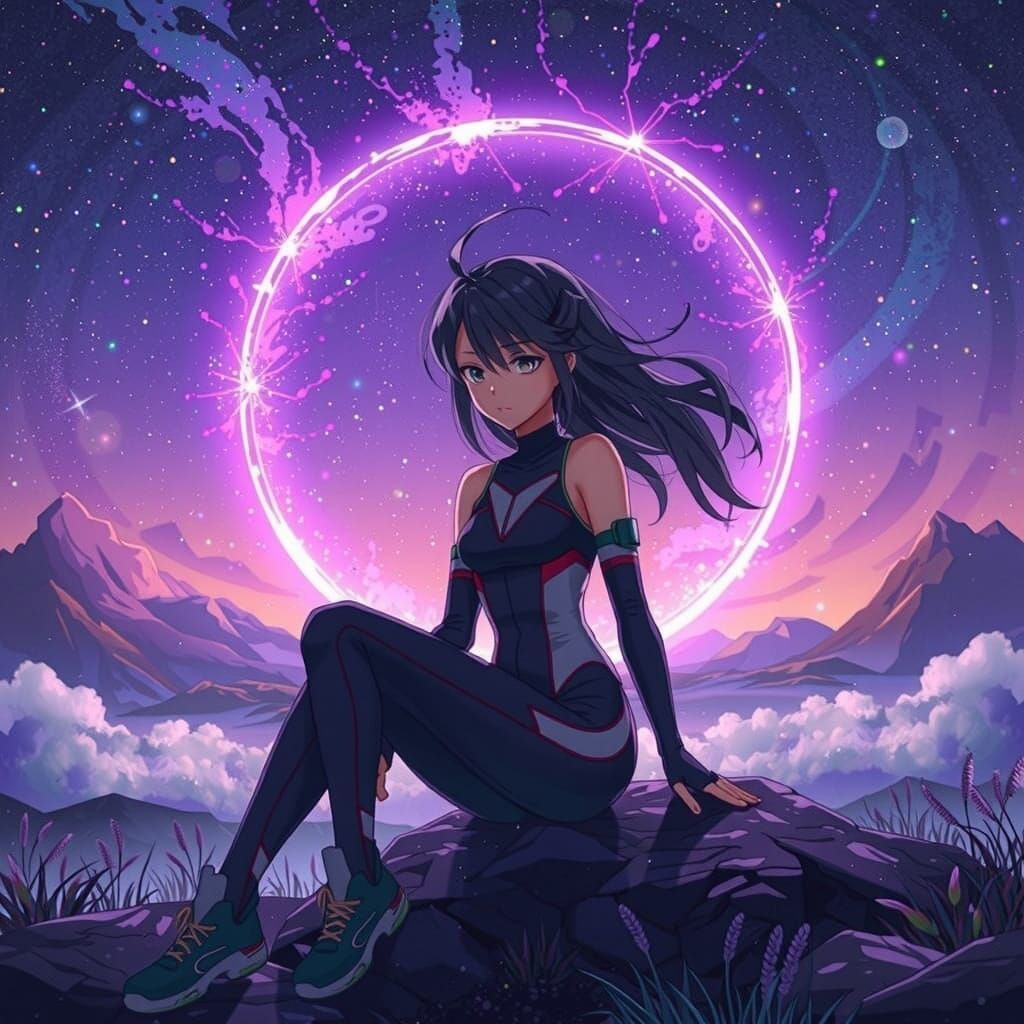 This image shows an anime girl with dark hair and a sporty physique sitting on a rock in a cosmic landscape under a starry sky. The vibrant image is rendered with cinematic lighting and fantastical details.