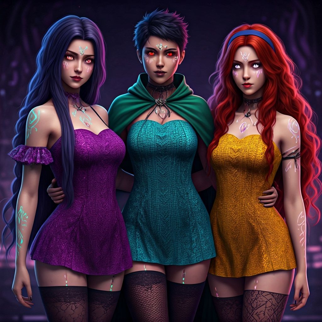 This image shows three Kpop Demonhunters in alluring poses on a dark stage. Featuring bioluminescent tattoos and a mystical concert background, rendered in an epic fantasy concept art style.