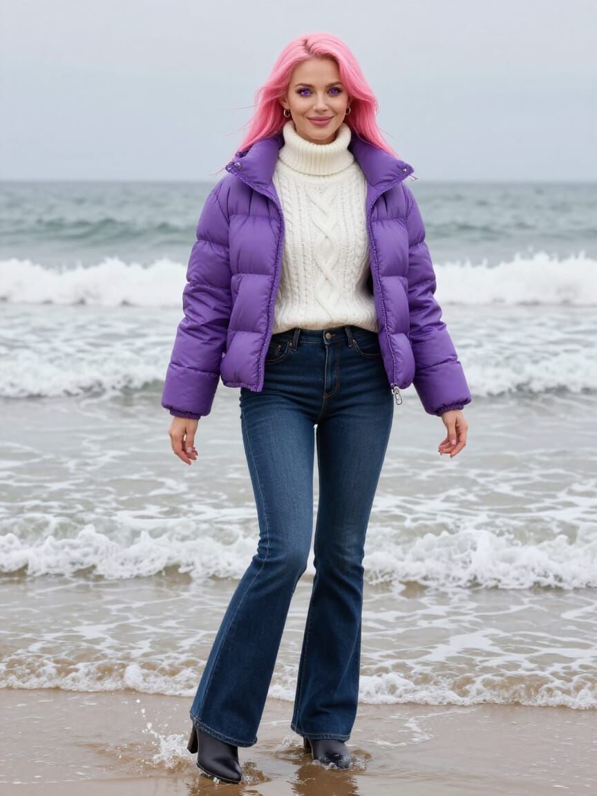 This photorealistic image shows a woman with pink hair wading in the ocean surf. She wears a puffer jacket and flared jeans, with waves gently touching her boots.
