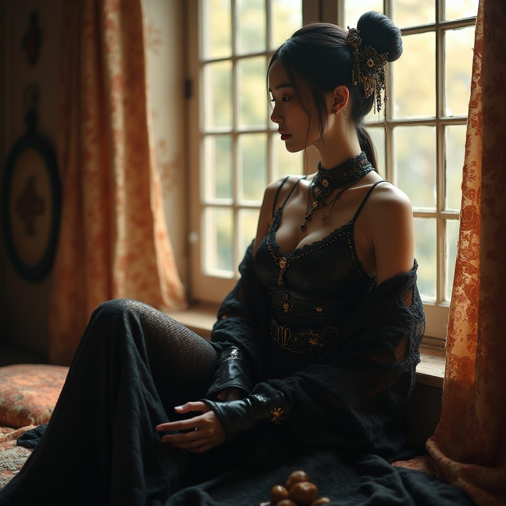 This image shows an elegantly dressed Japanese woman in black leather and lace sitting near a sunlit window. The photorealistic style features intricate details and precise shading.