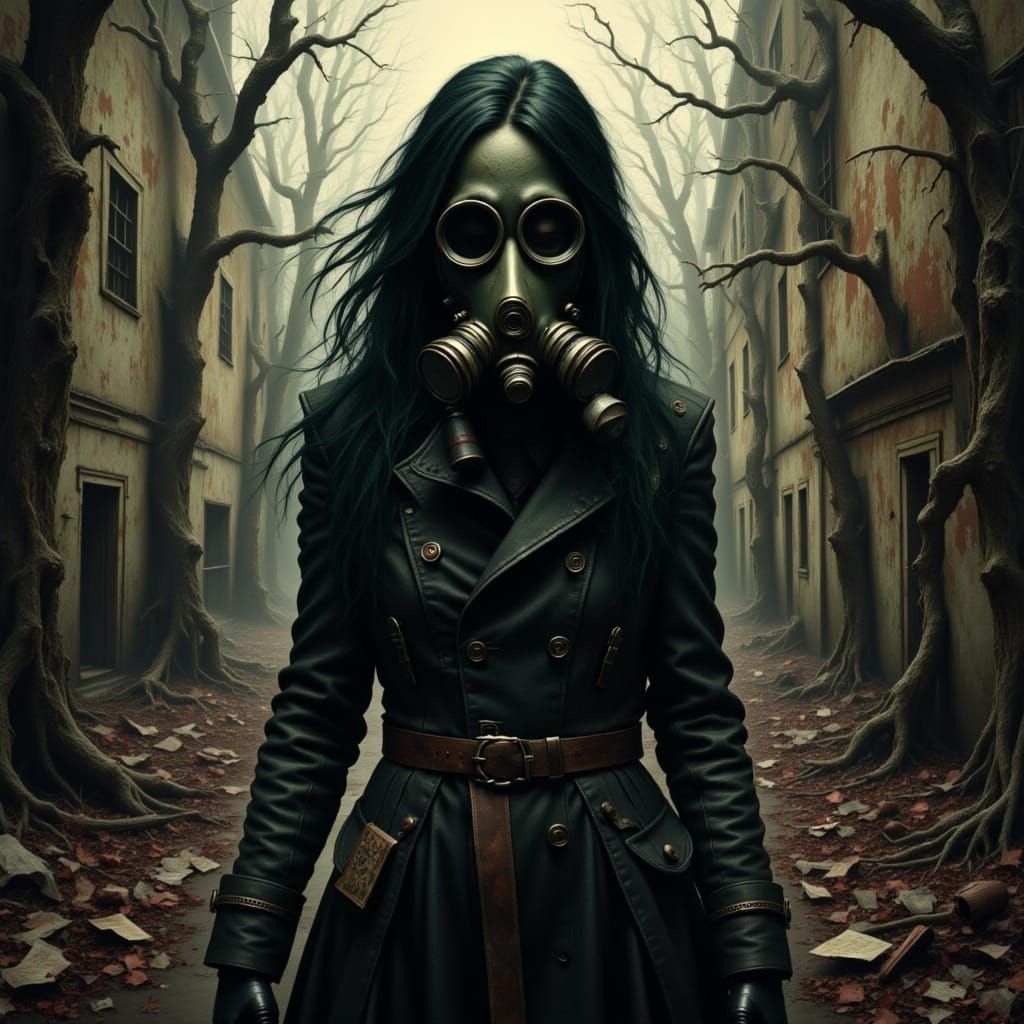 A chilling image of a woman in a gas mask amidst toxic smoke and hazard signs. The scene evokes a dark, Gothic atmosphere with bold lines and muted colors, reminiscent of classic etching techniques.