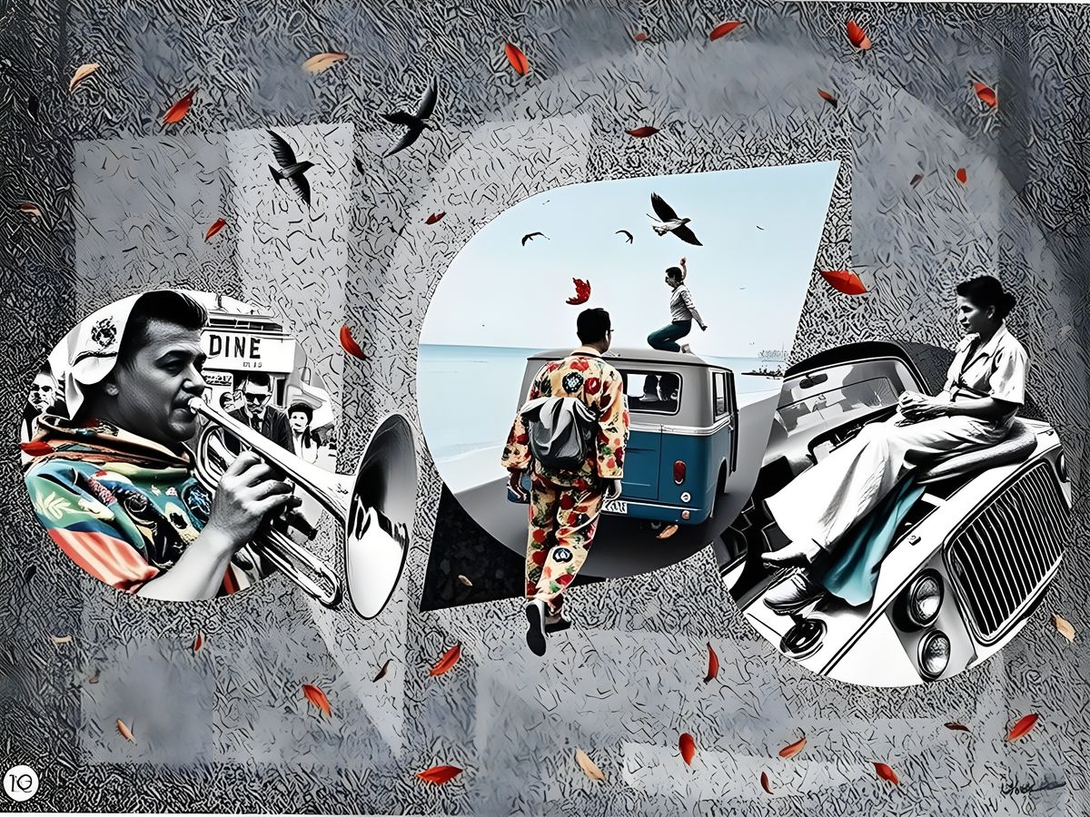 Autumn collage with a woman in colorful kimono in Retro-futuristic oil painting and alcohol wash, a beach scene in the 1950's, complementary light contrast, dramatic bus on storm everyday life. No artist Signature.