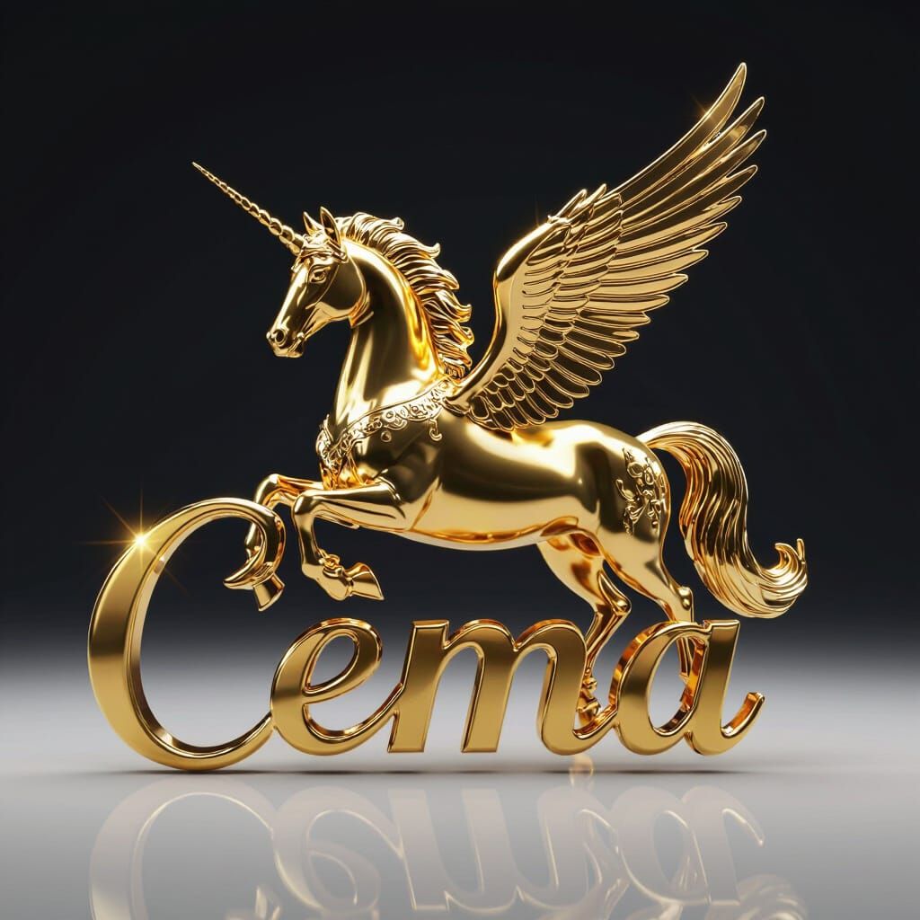 This image shows a majestic Pegasus with stylized head and extended wings, crafted in polished metallic gold with brilliant reflections. The design, inspired by luxury emblems, features intricate details and a transparent background.