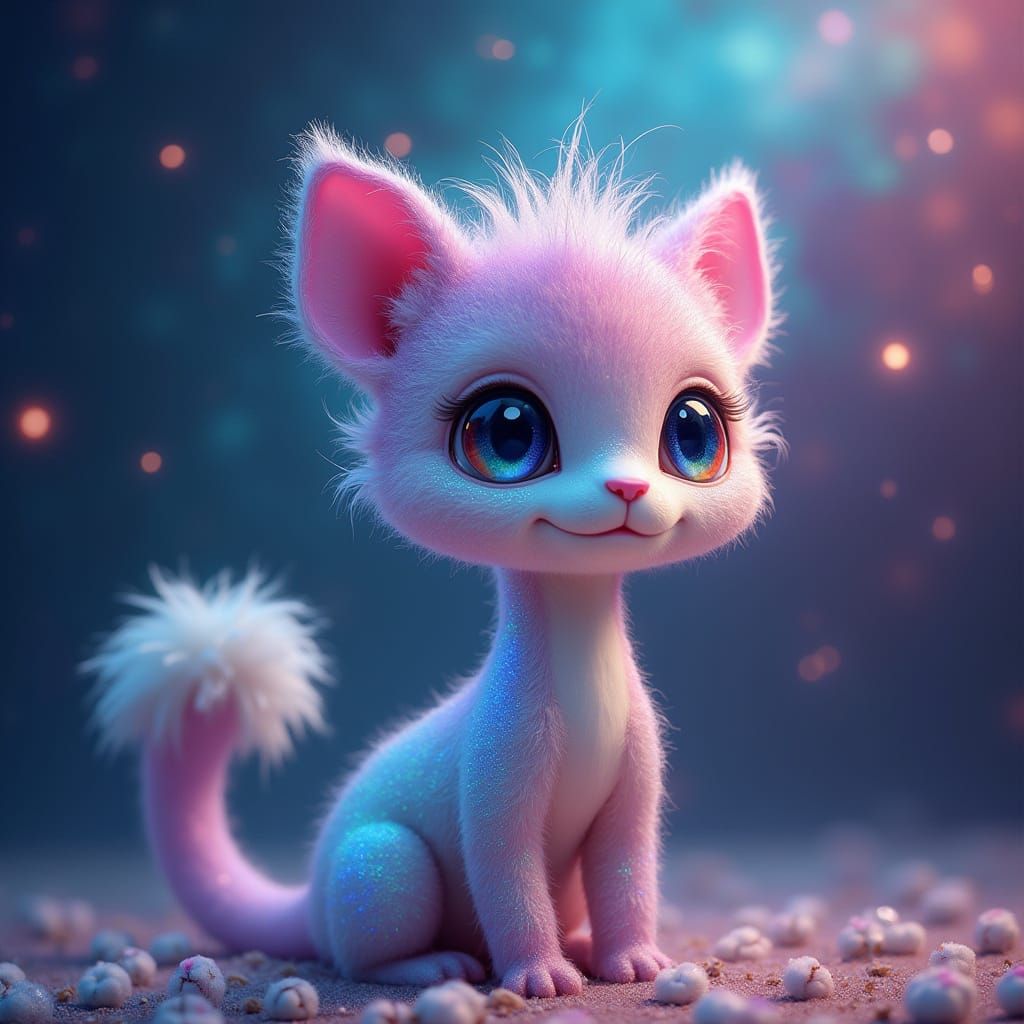 A striking picture of a vibrant, otherworldly creature with silver adornments against a colorful backdrop. The soulful eyes reveal a swirling galaxy, in a dreamy, cosmic style.