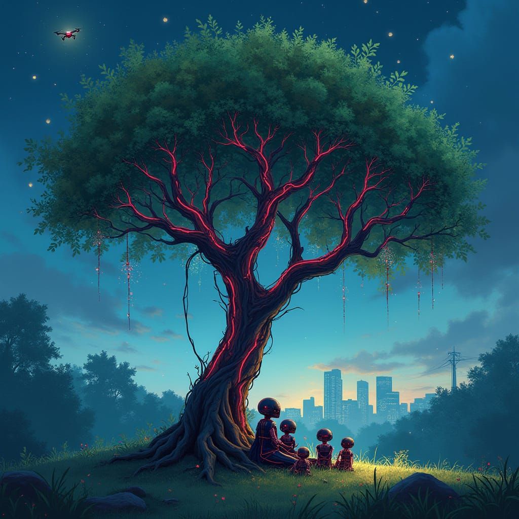 This illustration features an ancient willow tree with branches as Wi-Fi antennas, its bark illuminated by neon veins. Robots charge beneath it in a twilight park setting.