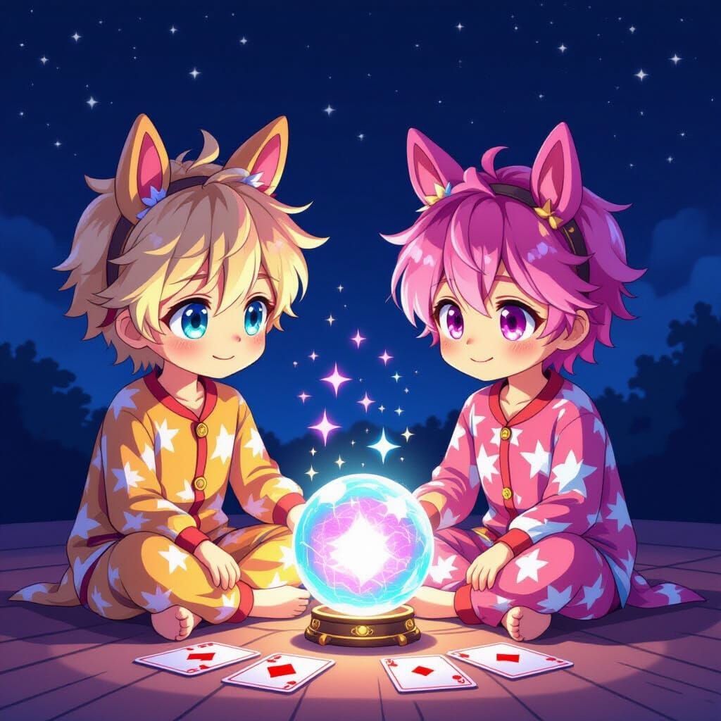 A vibrant image of two boys with horse ear headbands playing in a dimly lit room. Toro cards and a glowing crystal ball surround them in this cel-shaded, manga-style artwork.