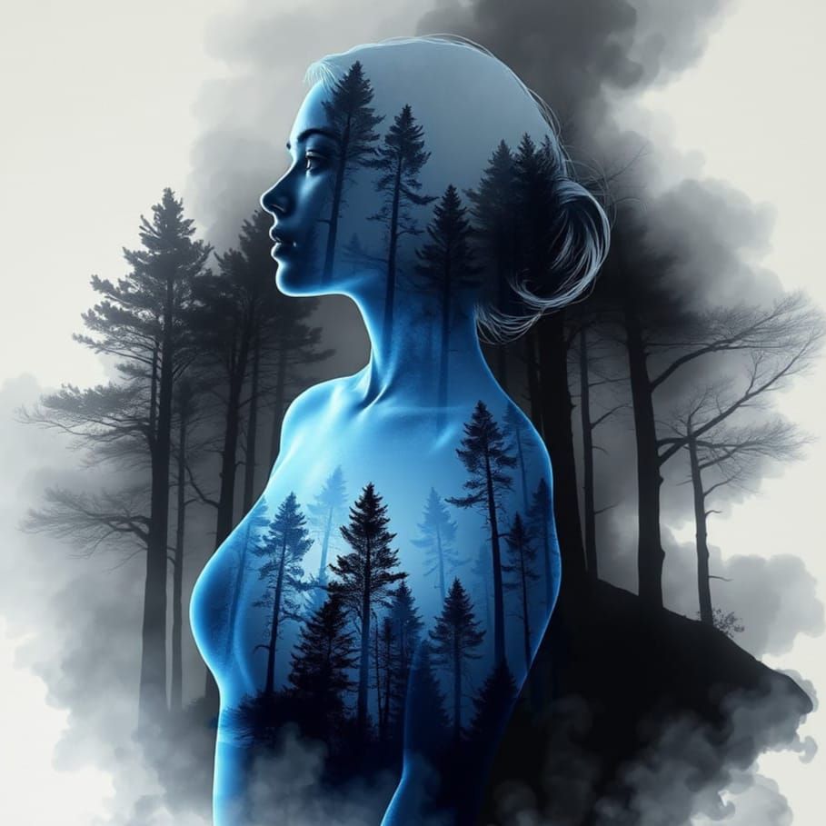 This image shows a glowing, transparent woman's head with a forest scene inside. The artwork features double exposure, fire, smoke, and ink effects in a surreal, fantasy style.