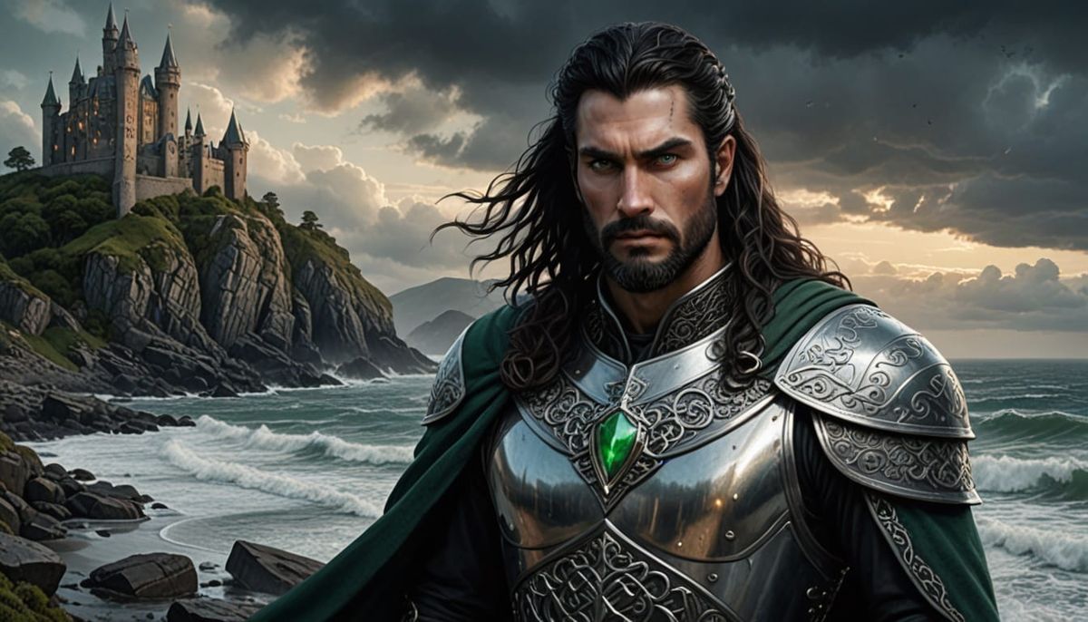 This image depicts a powerful king in gothic armor standing on a rocky shoreline, embracing a serene Celtic woman with curly black hair and delicate features, surrounded by intricate engravings and glowing emerald green accents.