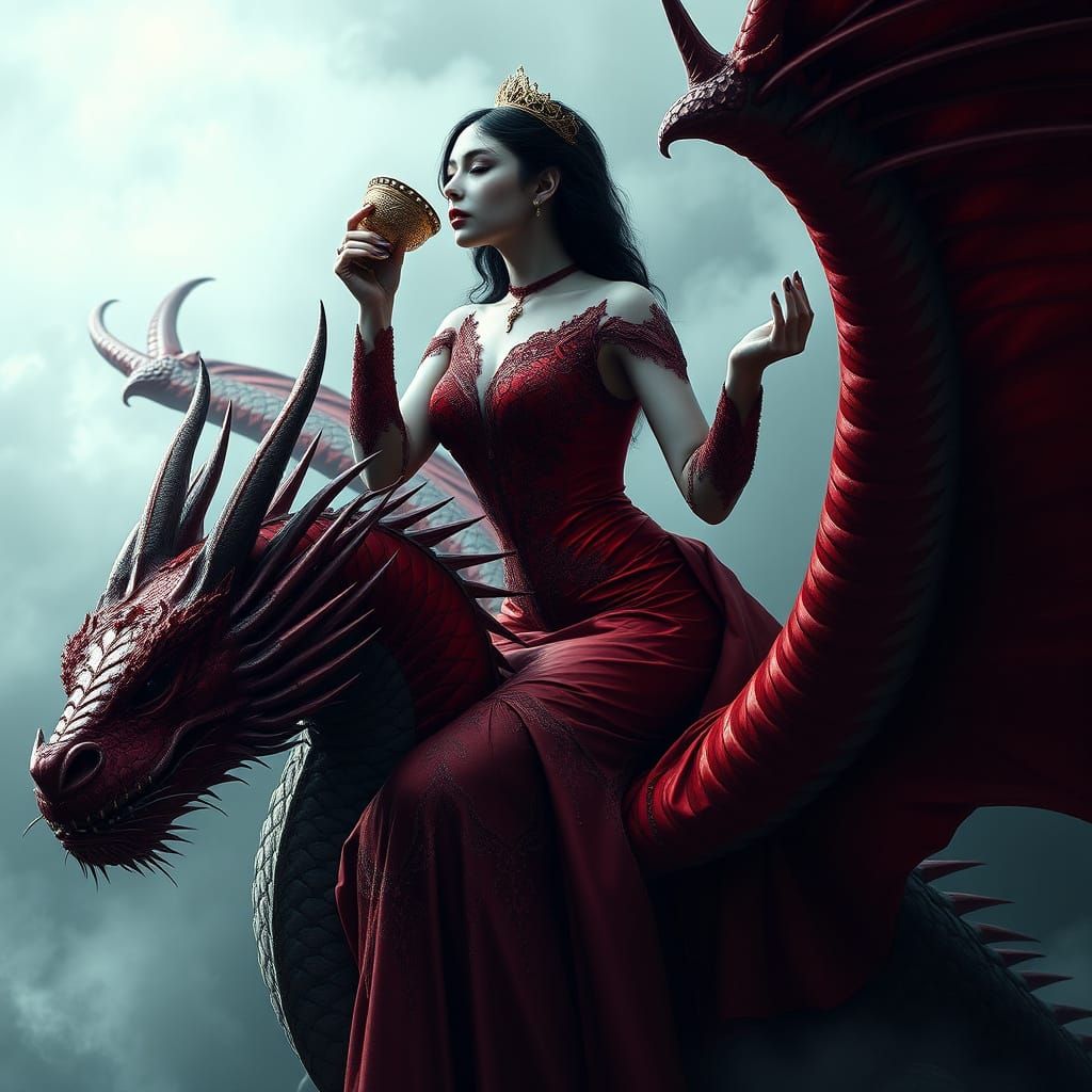 A mysterious woman sits atop a majestic dragon, savoring blood from a golden chalice, surrounded by intricate lace and gemstone details in a dark, gothic fantasy scene