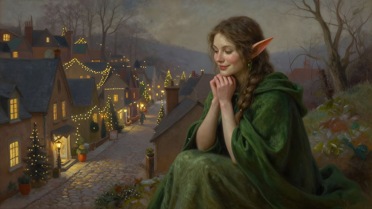 This detailed oil painting depicts a gentle female elf on a hill, viewing a town aglow with Christmas lights. The scene features warm light and intricate textures in a whimsical, ethereal fantasy style.
