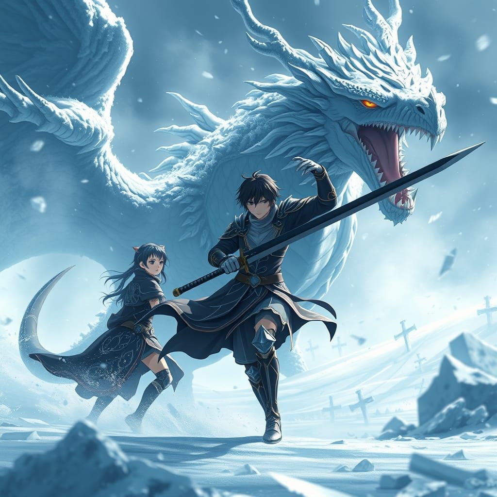 A high-resolution image shows three anime-armored figures, one wielding a black sword, fighting a frost dragon in icy mist. The digital artwork features cinematic lighting and textures.
