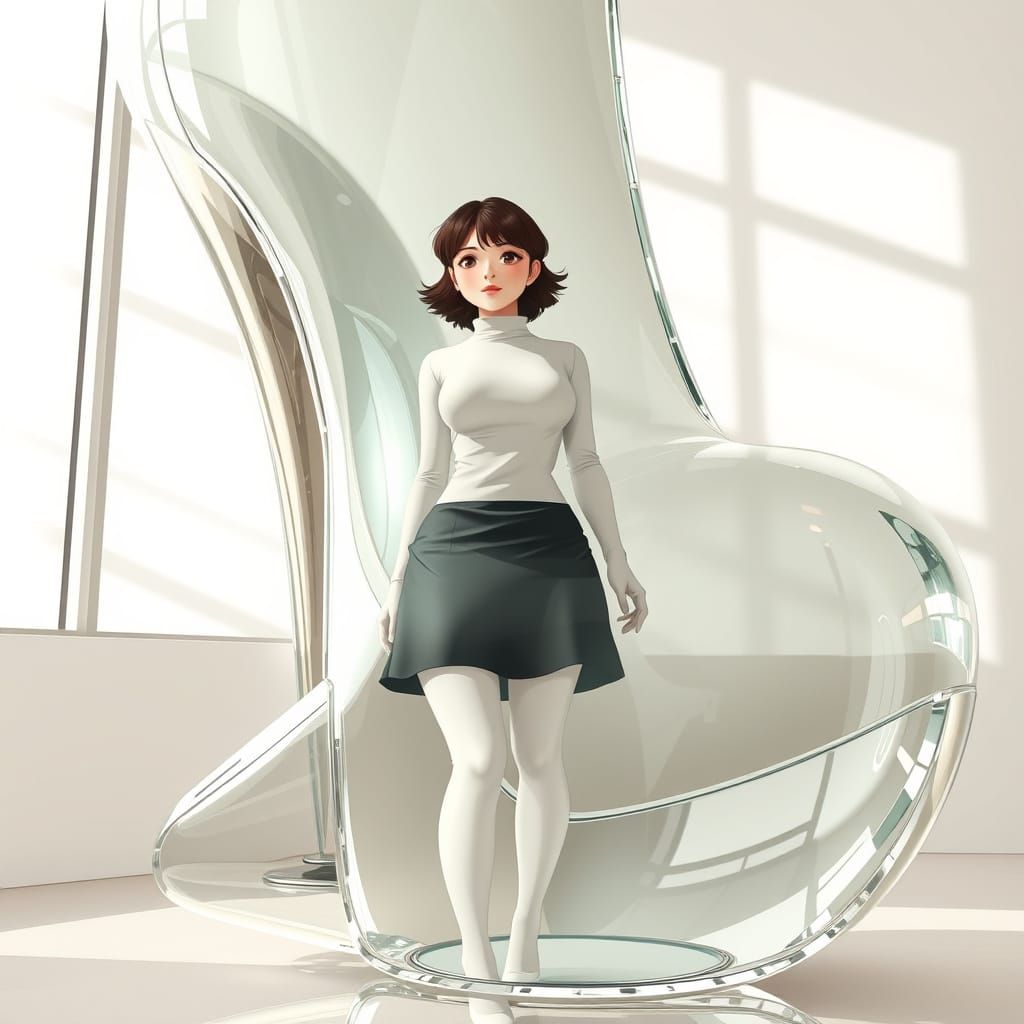 This image shows a curvy woman standing inside a massive glass high-heeled shoe, surrounded by vibrant light patterns. The shoe's enormity creates a striking contrast with her delicate figure, making for a captivating and dreamlike scene.