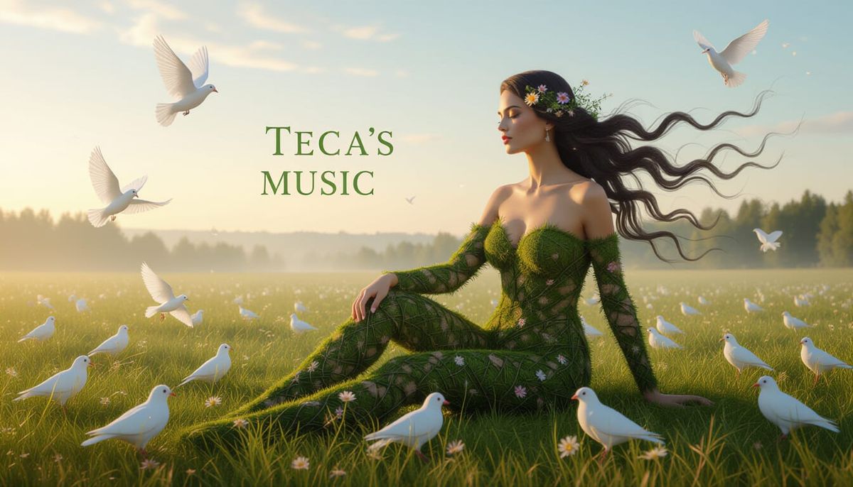 A surreal sculpture blends the female form with natural elements in a field of lupinus flowers. The image has etching and aquatint qualities, with silhouetted figures against a sunset.