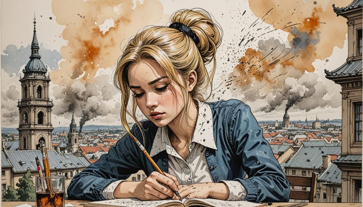 This image shows a blonde Vietnamese schoolgirl daydreaming in class, surrounded by swirling ideas. A stern teacher watches over her as the other students sit frozen. The style evokes ink drawings with watercolor accents.