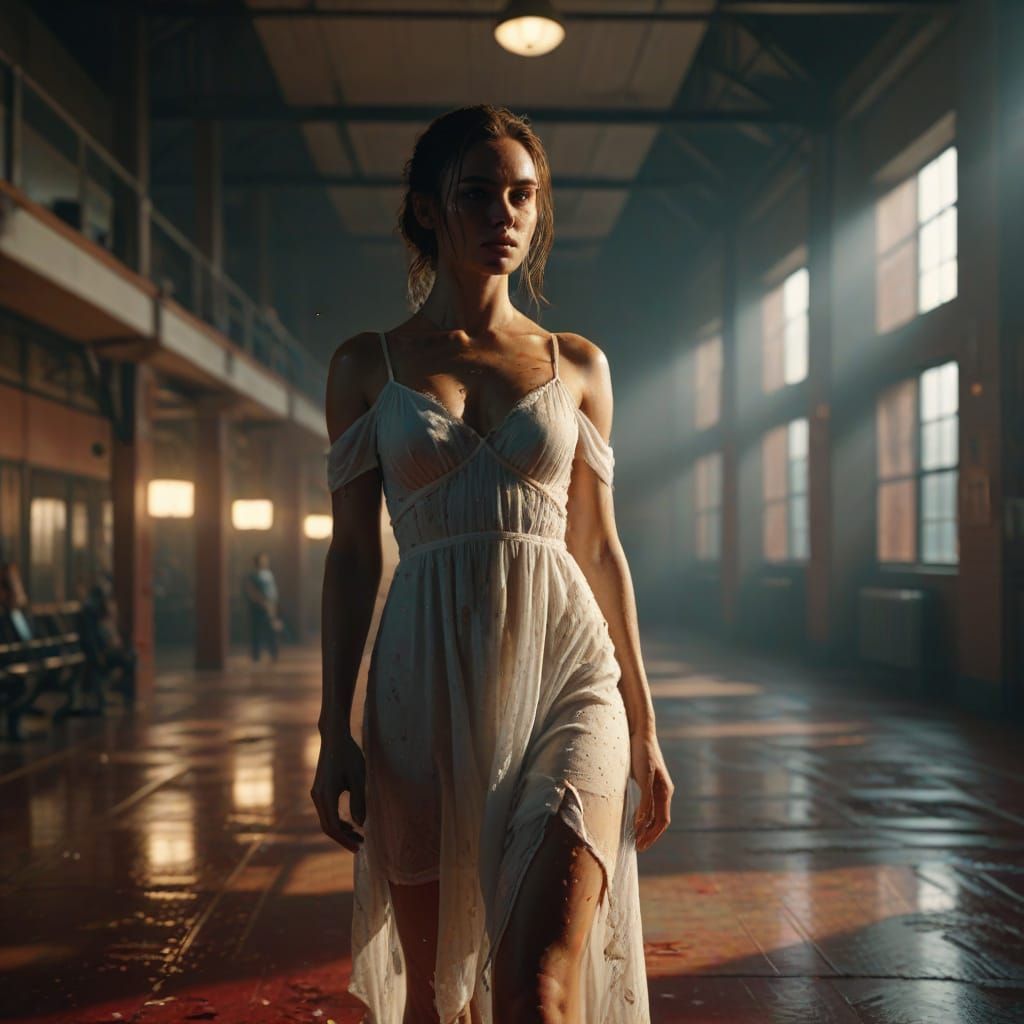 A hyper-realistic cinematic image of a young woman in a white dress, covered in a crimson substance, standing in a lavish high school gym. The image is rendered with detailed textures, deep shadows, and golden hour lighting.