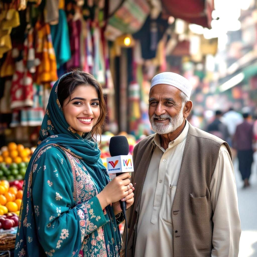 This image shows a young news reporter interviewing an elderly man at a vibrant outdoor market. Colorful shops and bustling crowds form a lively backdrop for the street scene.