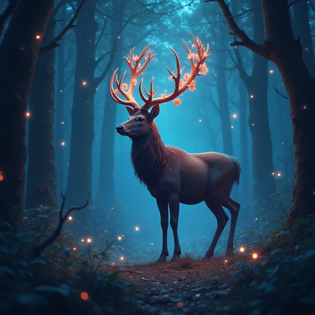 This image shows a glowing stag in a forest, its antlers decorated with flowers. The stag's fur shimmers in the light of fireflies and dancing shadows, in a detailed matte painting style.