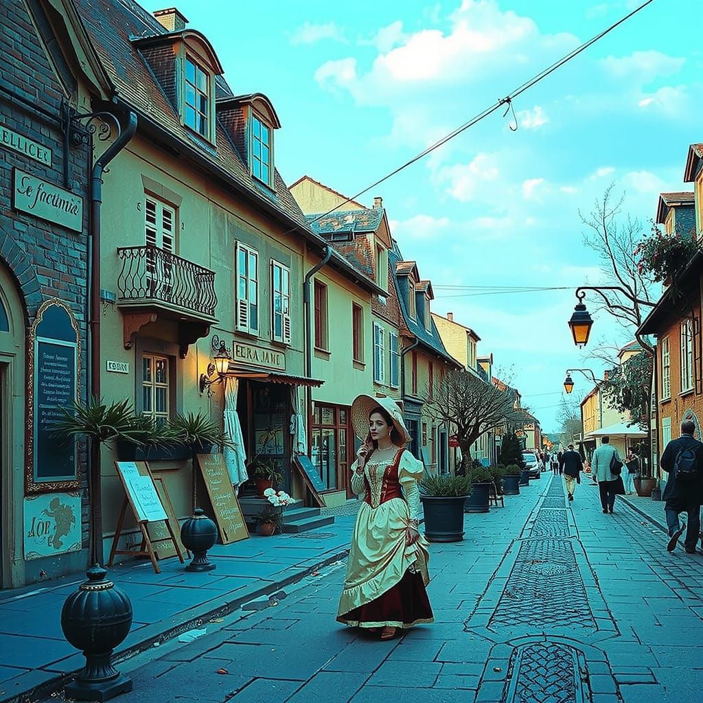 A figure in vintage clothing stands in the French countryside. Golden light and intricate details evoke a romantic aesthetic.