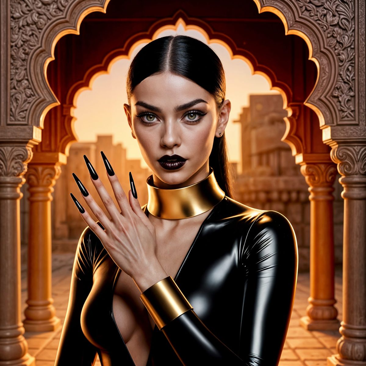 This image shows a striking young Arabian woman in a black latex outfit, with bold makeup and opulent jewelry. Captured in warm light against sandstone arches at sunset, evoking quiet power.