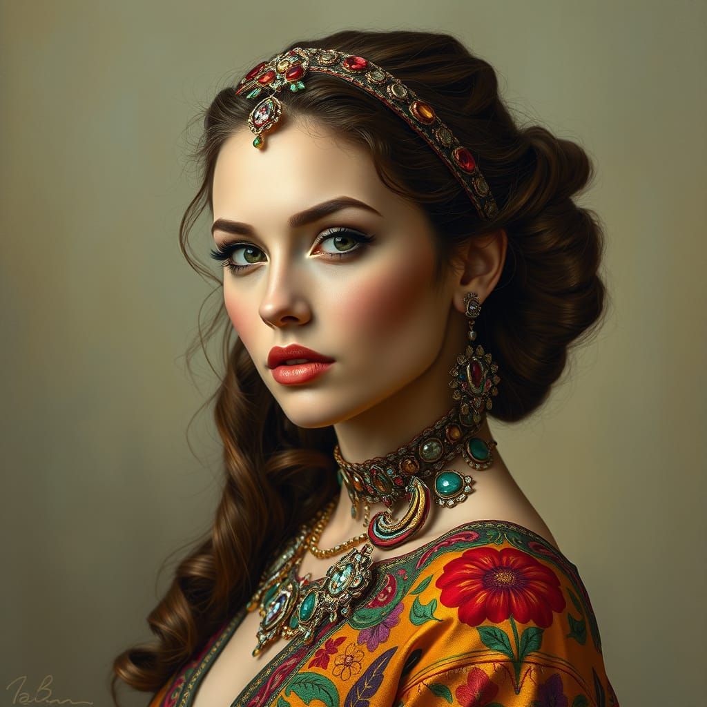 A captivating portrait of a woman adorned in vibrant, futuristic attire. This image captures a confident gaze rendered in hyperrealistic detail, reminiscent of classical oil paintings with warm, golden lighting.