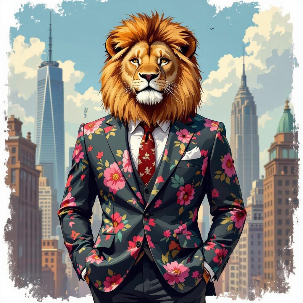 A regal lion stands amidst city skyscrapers wearing a floral suit and a charming smile. This image showcases bold colors and meticulous details in a vibrant anthropomorphic style.