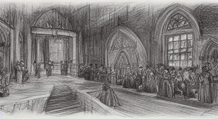 This image shows a monster feasting on humans in a dark, gothic banquet hall. Rendered as an old pencil sketch with smudged graphite and gloomy, blood-red lighting. A macabre and unsettling scene.