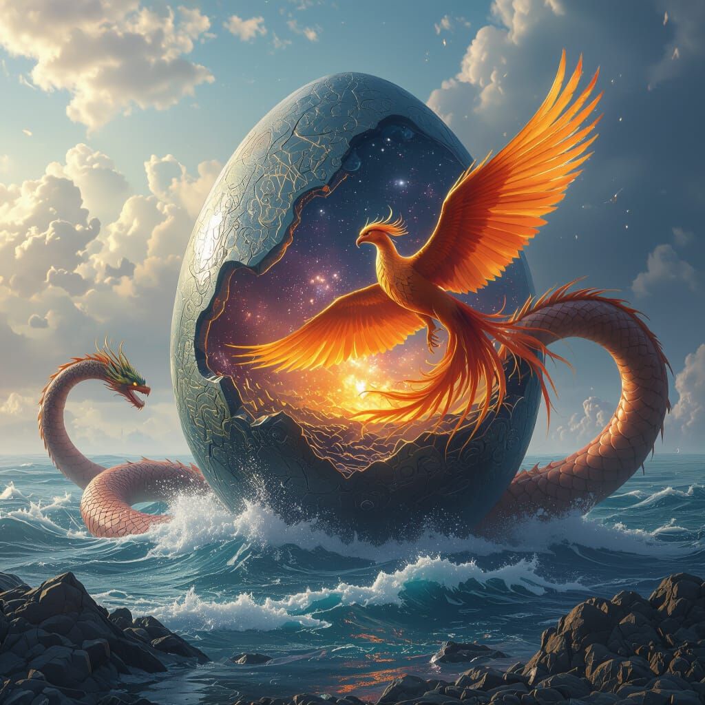 A detailed matte painting featuring a cosmic egg, phoenix, and sea serpent in a deep fantasy scene. This artwork uses complementary colors and intricate detail, rendered in a splash screen style.