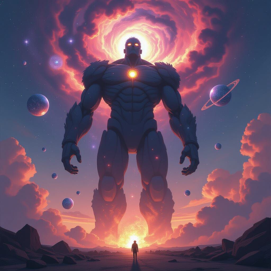 A striking picture of a giant humanoid formed from nebula and starlight. The figure rises from a collapsing supernova, with galaxies swirling across its skin in a photoreal anime style.