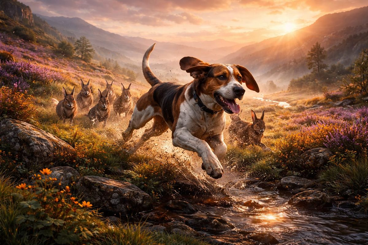 A hound running away from a pack of hares, across moorland in the morning sun.
