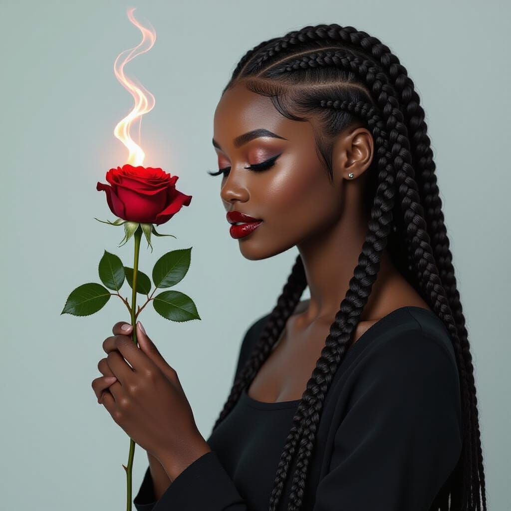 A striking editorial image of an African woman with braided hair, holding a dying rose with a faint spirit departing. She looks at the rose with a sinister smile.
