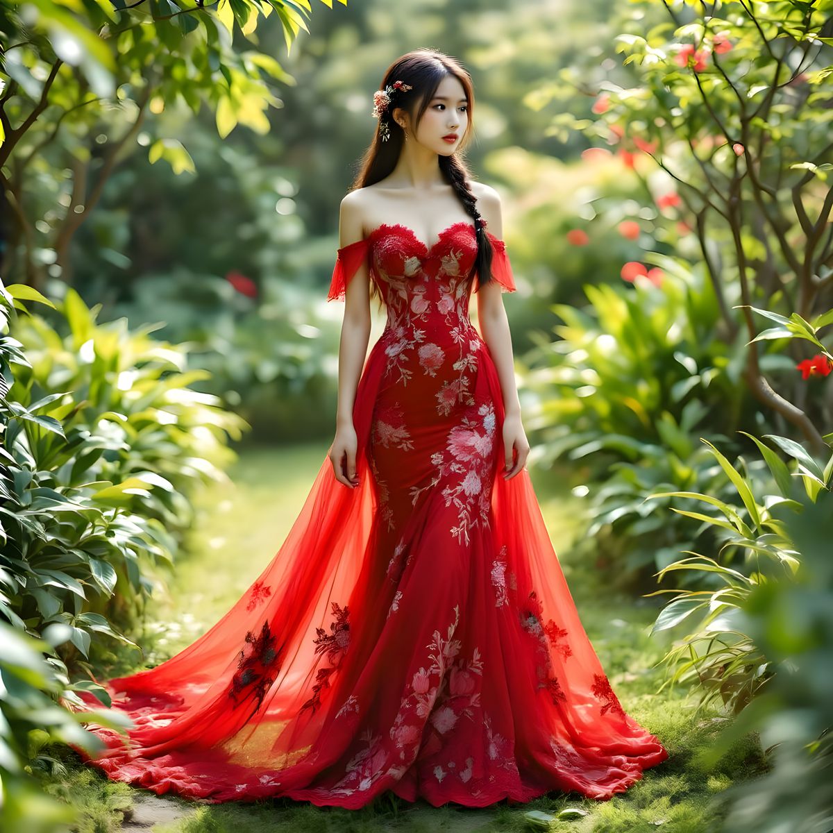 This image shows a young Asian woman in a red, embroidered mermaid gown standing in a lush garden. She has long dark hair in a side braid, and the scene is serene with soft lighting.