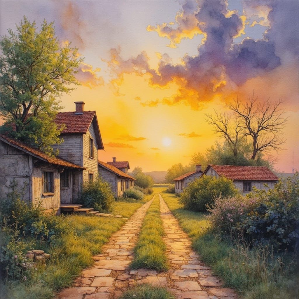 A watercolor painting of a quaint old village at sunrise. The artwork features impressionistic brushstrokes, textures, and dramatic lighting, reminiscent of neo-impressionism and post-impressionism.