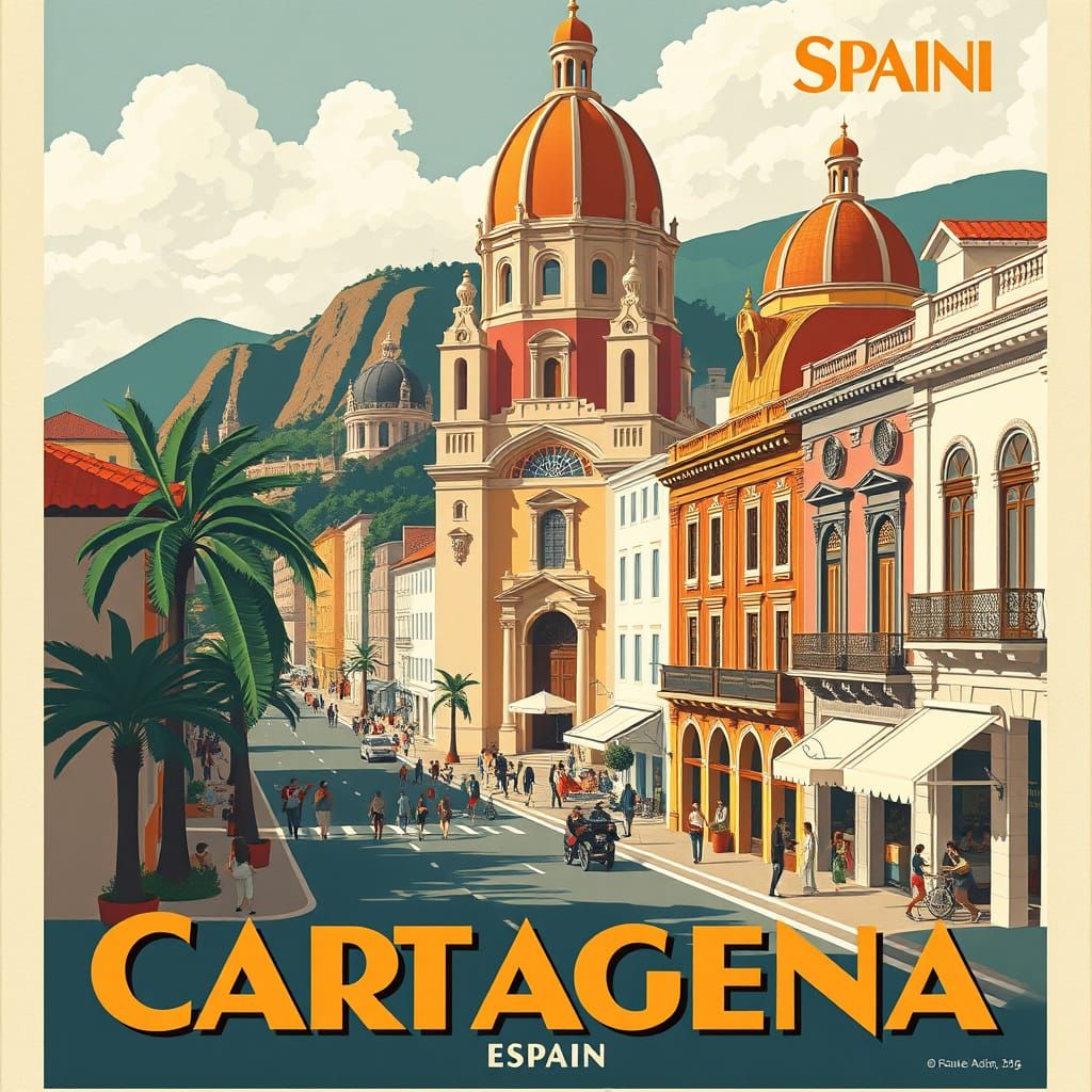 A vintage travel poster of Cartagena, Spain. The image displays the city's vibrant streets and historic architecture in a 1940s Art Deco style with warm, inviting colors.